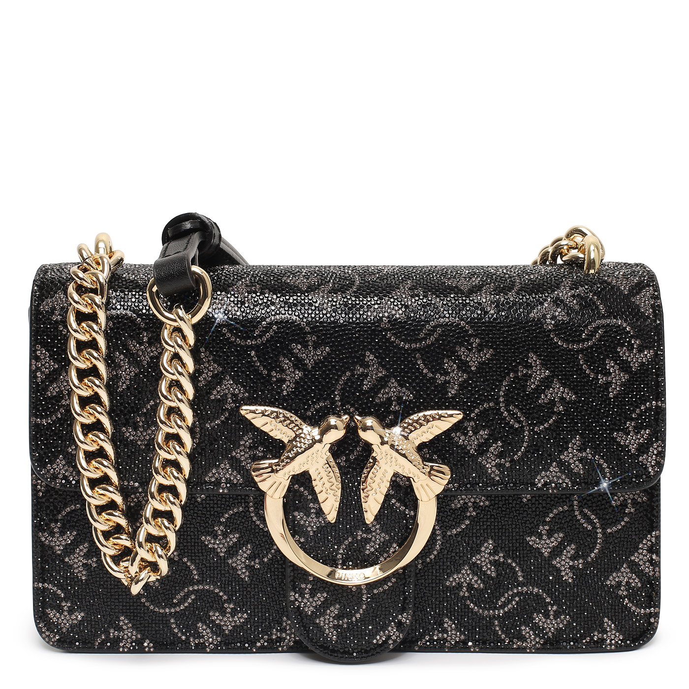 Сумка через плечо со стразами Pinko Love One 103335-A20D/ZI1Y_nero/argento - 2000558631860 черный натуральная кожа, полиуретан 21 x 12,5 x 9 Цена 53900 руб. купить в интернет-магазине PanChemodan.ru в Ростове-на-Дону